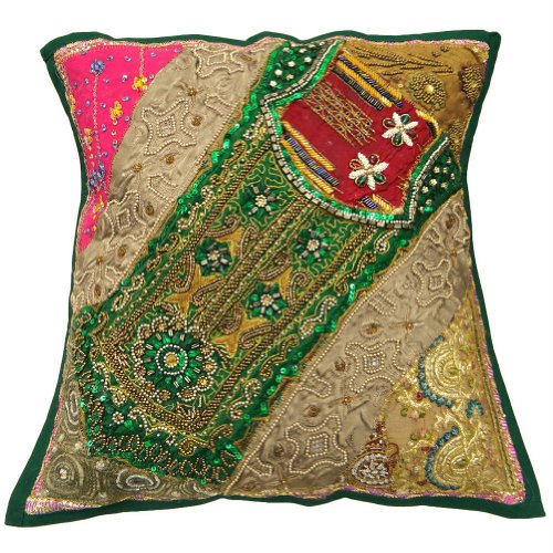 1 pièce inde main verte housse de coussin patchwork perles sari coussin décoratif décoration à domicile cas 17 "pouces